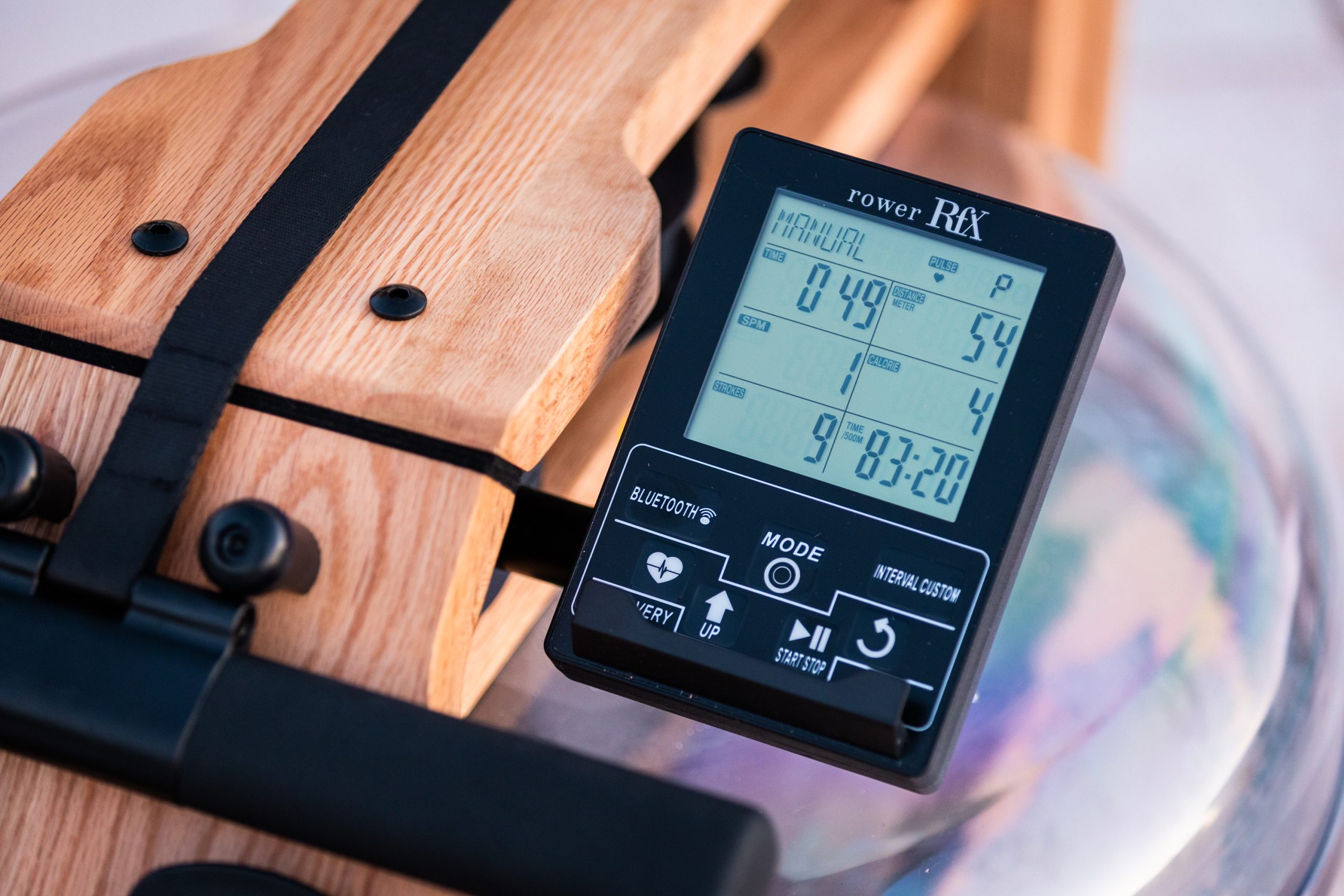 Ein eleganter Monitor ermöglicht die Verbindung mit den erwähnten Apps Am Bildschirm werden zunächst alle notwenigen Daten angezeigt (Trainingszeit, geruderte Distanz, verbrauchte Kalorien, Zahl der Ruderbewegungen pro Minute, Zahl der Ruderbewegungen in der momentanen Trainingsart, Gesamtzahl der Ruderbewegungen, Puls).