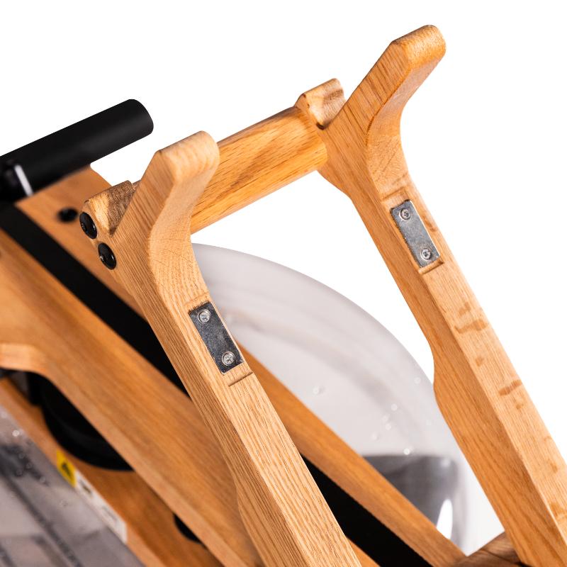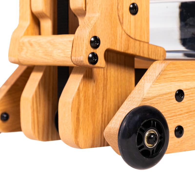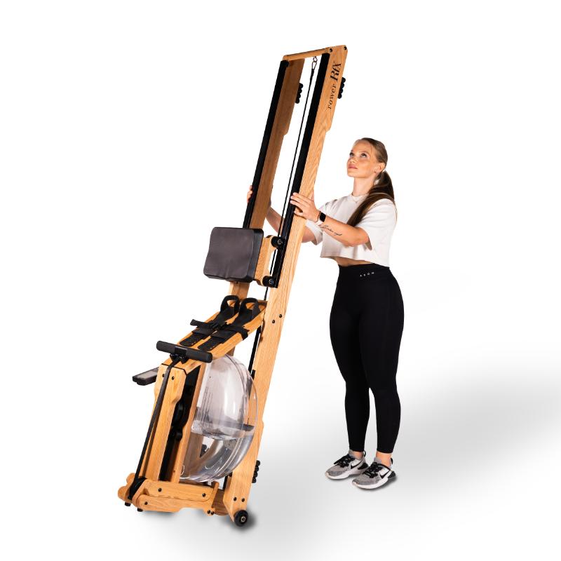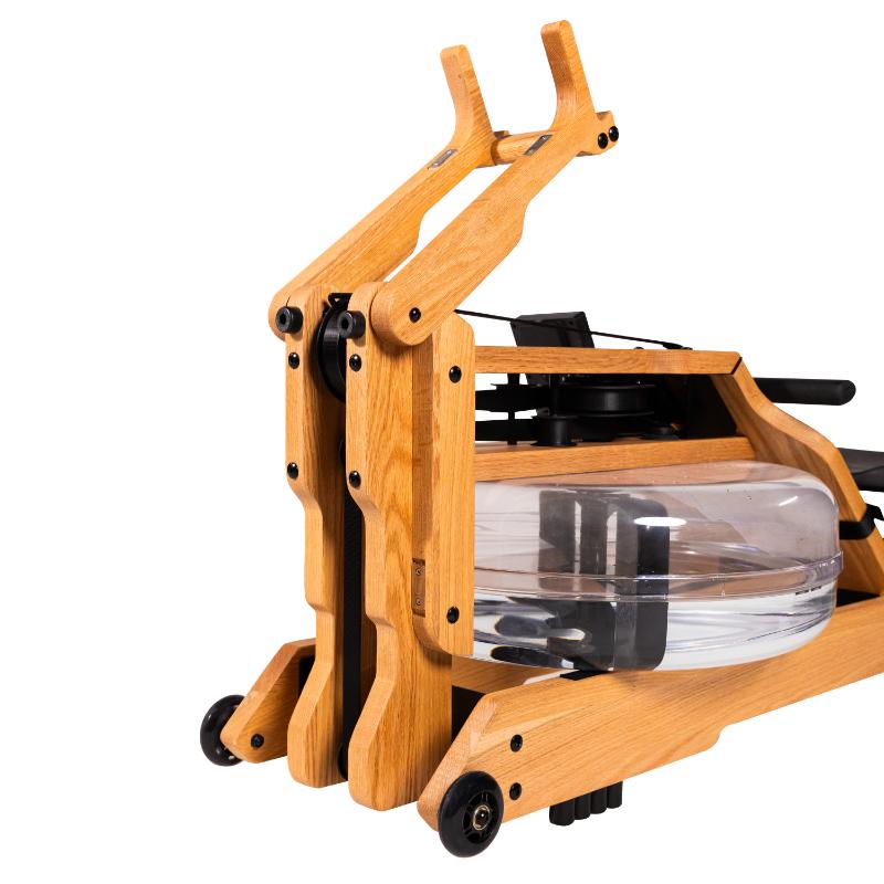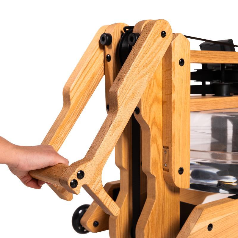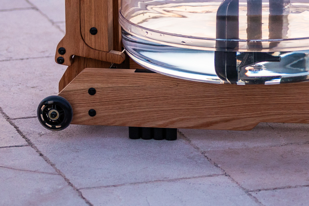 In seiner Endposition benötigt das Rudergerät nicht mehr Platz als ein gewöhnlicher Stuhl. Das Gewicht liegt am Wassertank, was ein einfaches Drücken bis an das Ende der Schienen ermöglicht. In jeder Position bleibt das Wasser sicher im Tank.